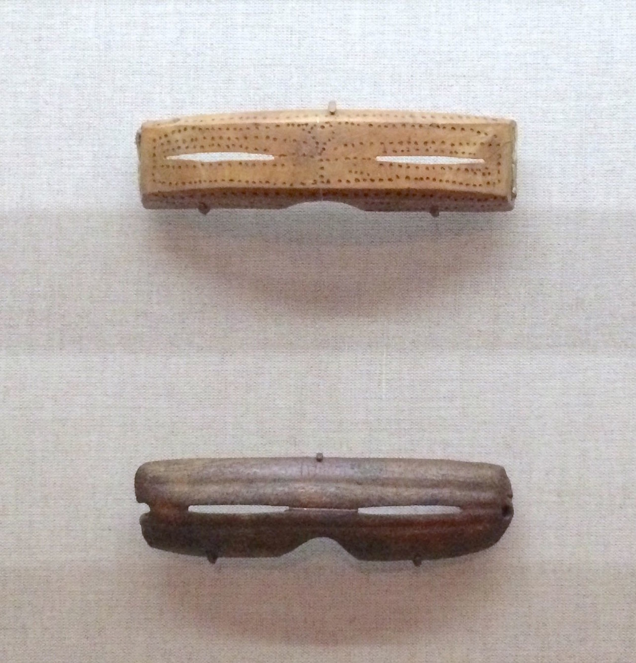 Fun fact: the first sunglasses were invented by the Inuit and Yupik people to prevent snowblindness. They were carved from spruce driftwood, caribou antler, walrus ivory, bone and other materials. They work by reducing the amount of light that comes in rather than by filtering. They can also improve visual acuity.